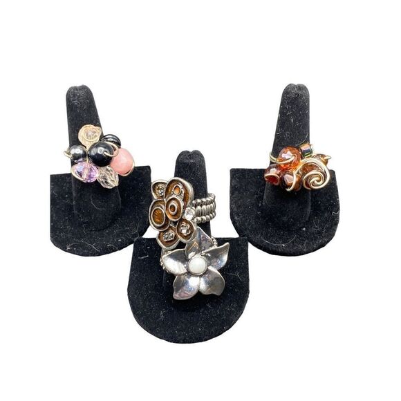 two stretchy -one is silver flower with white water and the other is a brown enamel swirls with rhinestones two silver tone wire - own with clear pink and black beads the other has shades of brown