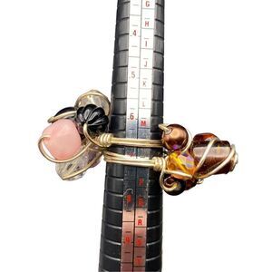 Lot of four rings two stretchy and two silver tone wire brown enamel, silver flo