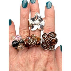 two stretchy -one is silver flower with white water and the other is a brown enamel swirls with rhinestones two silver tone wire - own with clear pink and black beads the other has shades of brown