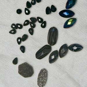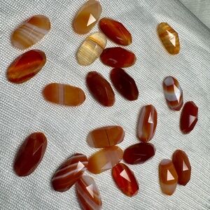 A lot of smaller cut red & orange carnelian banded, black onyx agate & black Czech glass gemstones for jewelry making. There are also a silver marquis & a black hexagon druzies. These other shapes are oval faceted & flat plus tiny pear sizes. 1/4 to 1/2 inches are approximate sizes.