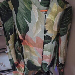 Classy Ted Baker green multi color abstract blouse size 5. Buttons down the front and at the cuff, 26 inches long. 27 inches puffed sleeves. 22 inches pit to pit.