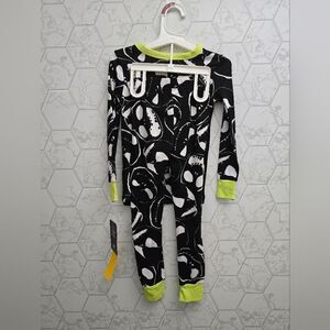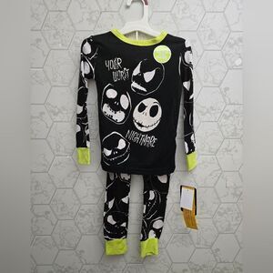 They'll be ready for Halloween night and beyond with The Nightmare Before Christmas Jack Skellington 2-Piece Glow-in-the Dark Tight Fit Pajama Set. This black pajama set includes a long-sleeve sleep shirt and a pair of pajama pants, both covered with Jack's face print and contrasting green hem and neckline. With the glow-in-the-dark feature, this two-piece pajama set makes a perfect addition to their bedtime wear and is made with soft and stretchy fabric for comfortable wear.. Flame resistant