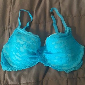 Two super cute unlined lace bras with underwire, 32 C, bright teal and neon orange/pink. Never worn, blue still has tags attached. Very cute flirty colors!
