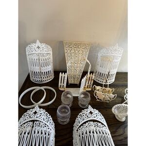 This is a large lot of vintage plastic wedding decor; some are for the cake, some are table top decorations; all are plastic, some have more wear than others - the arch is not even on both sides but still could possibly be used. There are gates, little cups, little favor baskets, coup glasses, two large plastic rings, a small arch, I have another lot from the same estate that I will be listing tomorrow. The gates measure 7" x 4", the bells are 3" across, the baskets are 3" x 1 1/2", the coup glasses (3) are 3" x 1 1/2", the tiny glasses are 1 3/4" x 1 1/4", the arch is 5 1/2" x 6". Perfect decorative item or for a wedding shop. Please see pics for condition of each item. These can also be used for a vintage inspired bridal shower.