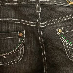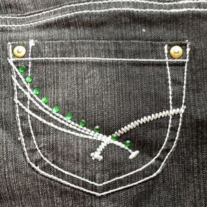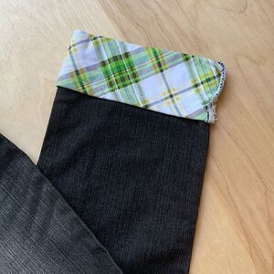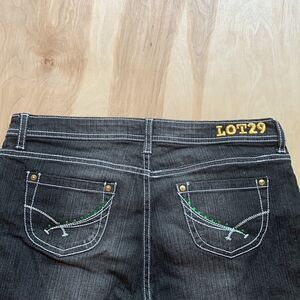 Lot29 denim capris are just too cute! They are black and pre-washed. They have white stitching throughout. Five pockets. Gold stitched “Lot29” on back. Design on back pockets with green stones. 3” plaid cuffs on bottom. Cuffs are lime green, yellow, black and white. Waist flat across is 17”. Hips flat across is 20”. Inseam is 22”.