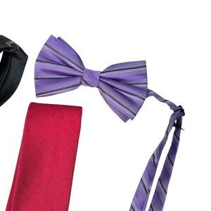 Three penguin ties with a unbranded bowtie that I never used. The whole bundle is in great condition no major flaws. Two of the ties are silk and the other is cotton poly.
