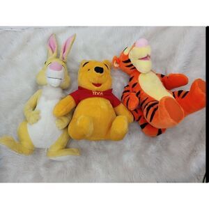 Lot Of 3 Pooh Rabbit Tigger My Talking Tigger Winnie The Pooh Friends Tigger is the only one who talks. Tigger is not torn that is the battery pack. All measure around 18" measuring butt to head on Pooh.