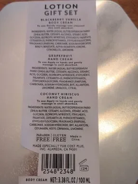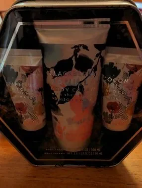 Includes a pink Twisted Peppermint travel-size lotion and a floral-themed boxed cream trio. Festive peppermint scent on the travel lotion. Floral hand creams in a decorative tin. Great for gifting or travel.