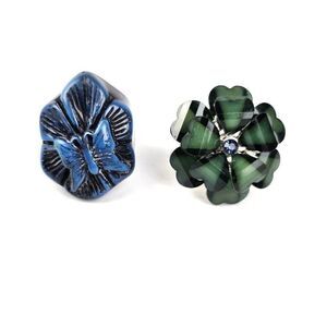 Great vintage condition.  One ring is all plastic, carved in more of a block style featuring a butterfly sitting on a flower.  The second is plastic / silver metal combo with faceted plastic petals.  Both rings are large in size with approximately 1.5" in length.