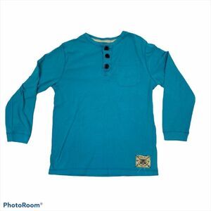 One teal colored long sleeved shirt with three buttons and a pocket from Old Navy