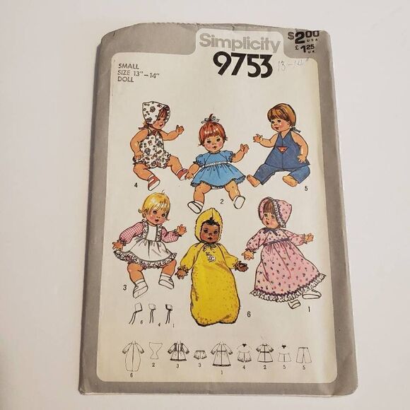 2 vintage patterns from Simplicity , both are for doll clothes, one is for small dolls 13"-14"and the second is medium for 15"-17" dolls. They are from the 1980s both envelopes are in great condition and patterns are both uncut and unused.