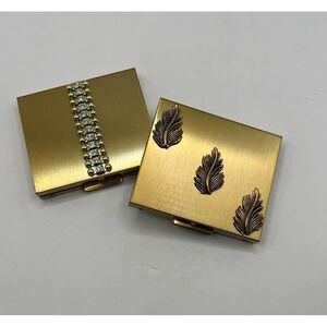 These two compacts have never been used and are in excellent condition. One of them has a small dot on the mirror. They both have there original puffs. One has three leaves and the other has a rhinestone motif. They come with the original box from the store they were bought from. They are beautiful.