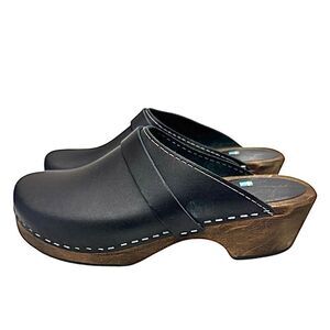 Step into timeless Scandinavian style with these Lotta From Stockholm Women’s Classic Clogs in EU 38 / US 7.5. Handcrafted in Sweden, these clogs feature Italian vegetable-tanned oiled nubuck leather uppers in black and a sustainably sourced brown Swedish Alder wood base.