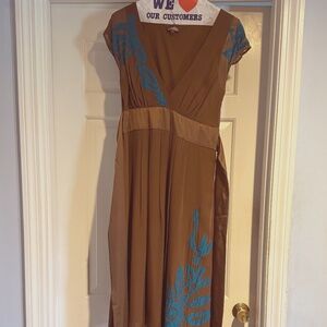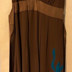 Rich brown color with turquoise appliqué trim. Sash tie in back. 100% silk. Side zipper.