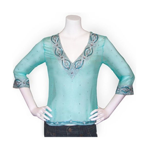 • Details: Standard v-neck. 3/4 length sleeves. Silver and aqua embroidery accent the hem, sleeves and along the v-neck. Detailed beadwork. Silver sequins dot the entire garment. 3-inch slits at each side.