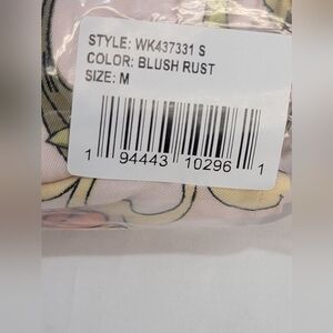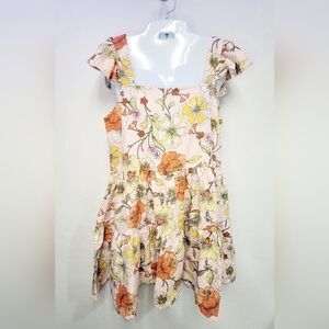 New With Tags Lottie & Holly BOG Band of the Free Collaboration Women's Size Medium Blush and Rust Floral Mini Dress, Crisscross back feature, Tiered skirt, Ruffle strappy sleeve, pullover, square neckline.