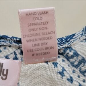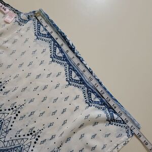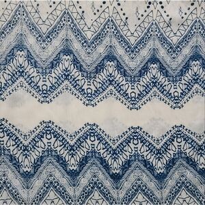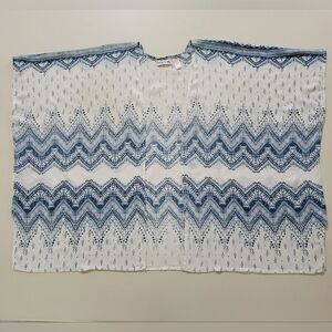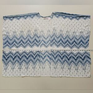 Lottie & Holly by Band of Gypsies open front kimono can be worn over your tank tops or cut off shorts, even a t-shirt with leggings or jeans. The rayon fabric is soft, lightweight and comfortable and the blue and white Ikat design gives a boho vibe. Last photo shows small holes that are in the blue portion of design- not noticeable when wearing. Priced according!