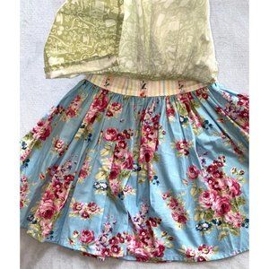 This dress fits many sizes as it ties at the waist and the shoulder straps are knotted to fit the child. Anne of Green Gables print on apron; floral on body. Perfect spring into summer. Can be worn as more of a dress when younger then as a tunic when older. So cute with shorties or bloomers or pair with a layering top and ruffle pants in cooler weather.