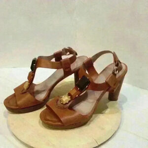 Lottusse Leather 3" heels, "Smithson"; Made in Spain. Leather Sole, Gorgeous pair of shoes. Wooden embellishments, very UNIQUE. Goodyear stitching. Gently pre-loved. No visible signs of wear except for a couple scratches on one heel. These are designer sandals. Size: 9/9.5 40 European