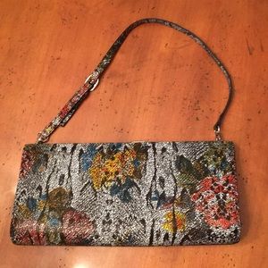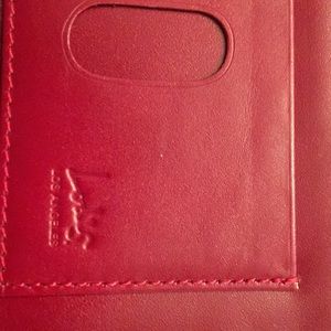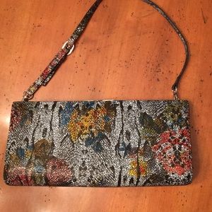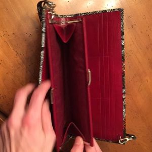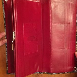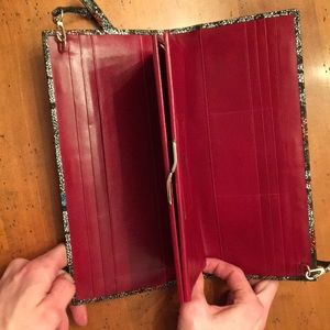 Slim leather evening bag with removable strap-if desired. This bag opens 3 ways, first to show space for cards. There is a snap open and close feature for small items. The other side opens to show additional card holding and enclosed space for various paper.