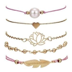 Five piece Feather, Beads, Lotus Flower, Pearl, Heart Beaded Charm Bracelets