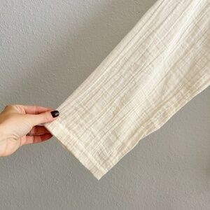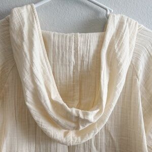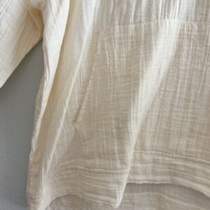 This is a sweet lightweight Baja pullover from Lotus & Luna brand. It was made from 100% cotton in a fair trade setting in Thailand. It is a gorgeous cream color and is nice and lightweight. It's got a v-neckline and wide sleeves. There is a pocket on the front and it has a hood. This is new without tags and has never been worn. This is a size small.