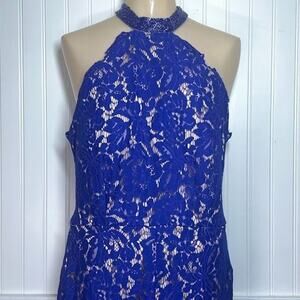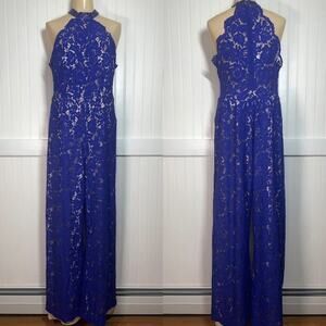 Lotus Threads Beaded Neckline Lace Jumpsuit Cobalt Blue Lace Illusion Halter