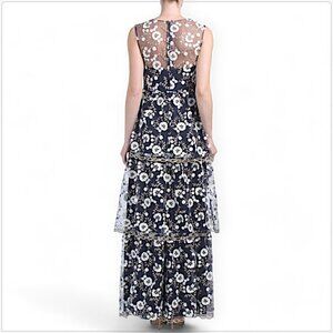 Fully lined with back zip close. Long tiered gown with sheer illusion neckline. Navy, white and metallic gold embroidered floral lace.