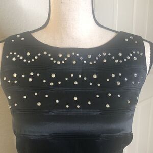 Gorgeous black dress to wear to your next event. Beautiful satin adorned with stunning crystals in a wave across bodice. The belt is missing, but a black or sparkly belt would work. Otherwise in excellent condition.