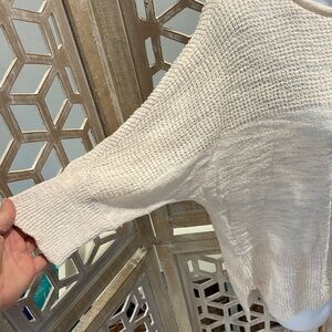 Textured 3/4 length dolman sleeve light weight sweater. Has a thin terry cloth feel. Color is cream with a hint of very pale pink. High-low split hem. Relaxed fit