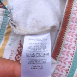 The Lou & Grey For Loft Getaway Peasant Blouse in White is a stylish and versatile addition to any woman's wardrobe. Made from 100% cotton, this blouse features a geometric pattern, long balloon sleeves, and a relaxed fit. With a V-neckline and pullover closure, it is perfect for casual occasions during the summer, fall, and spring seasons. The embroidered accents and collarless design add a touch of bohemian and hippie style, making it a great choice for those who love the beach or teacher look. Easy to care for and lightweight, this blouse is both comfortable and breathable, making it ideal for everyday wear.