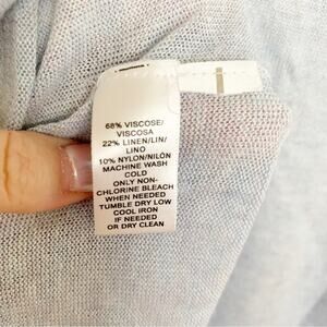 Light blue blousy long sleeve sweater. Lightweight. Drawstring hem. 68% viscose/22% linen/10% nylon. Size Medium. NWOT. Small mark on front that appears to be purple dye, an imperfection in the threads of the garment.