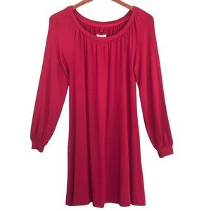 Cute and casual long sleeve dress with a scoop neck, pleated around neckline, and a knit soft material.