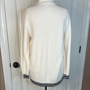 Elegant white cardigan sweater with navy accents. Perfect for layering and adding a touch of sophistication to any outfit.Pit to Pit 22” Length 30” NWOT