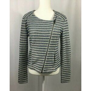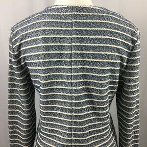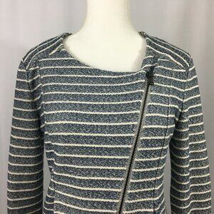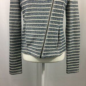 Lou & Grey Striped Blue White Career Sweater Jacket W Asymmetrical Zipper Size S. Condition is Pre-owned. Please see two pictures that show minor snags. Otherwise in excellent condition. Sold as is. Shipped with USPS Priority Mail.