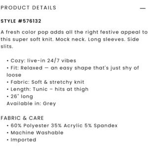 Super soft and cozy sweater with a high neck and a tunic length. Some pilling.