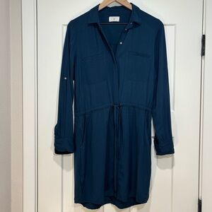 Chic teal button-up shirt dress. Features a classic collar, button details, and tie waist. Ideal for versatile styling.
