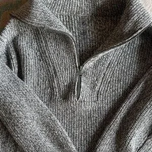 Soft ribbed knit with a half-zip collar. Long sleeves and relaxed silhouette. Side slits for easy movement. Comfortable everyday layering piece.