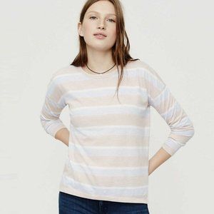 Excellent gently used condition. No stains or holes. Lou & Grey heather pink, white, and blue striped dropped shoulder long sleeve t-shirt. Slits at hems. Seam at center back. 60% polyester, 20% rayon, 20% cotton. Measurements (flat & approximate): bust 22", sleeves from neck to cuff 26", length 23", waist 22". Machine wash cold. No trades, please!