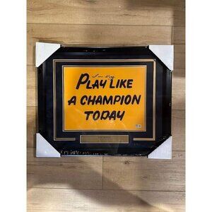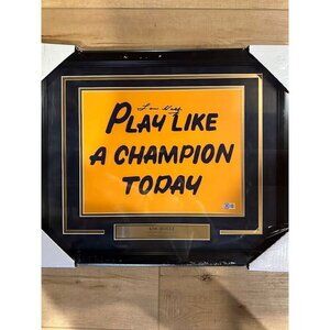 Lou Holtz signed autographed Notre Dame Fighting Irish "Play Like A Champion Today" 11x14 Photo Framed Beckett with navy suede over gold double v formatting, and gold plaque reading: (1st line: Lou Holtz, 2nd line: Notre Dame Fighting Irish, 3rd line: 1988 National Champions)