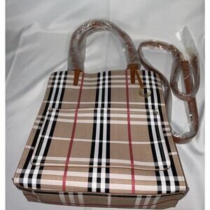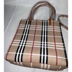 The Lou Lu Limited Edition Berry Collection Handbag is a large shoulder bag featuring a unique plaid exterior with strips pattern. The beige hardware and handle/strap add a stylish touch to this canvas bag with a multicolor fabric lining. This limited edition handbag by Loulu is perfect for women who appreciate quality and exclusive design in their accessories. The spacious interior and durable exterior make it a practical and fashionable choice for everyday use.