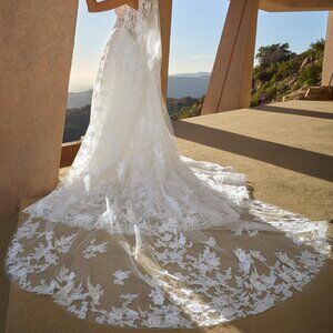 This exquisite bridal veil is a perfect blend of elegance and modern romance. Crafted from soft, sheer tulle, it features delicate floral lace appliqués that gracefully trace the edges and extend along the sides, creating a beautifully framed look. The lace detailing adds a touch of vintage charm while maintaining a contemporary feel. Designed to complement a variety of bridal styles, this veil drapes effortlessly, offering a sophisticated and ethereal finishing touch to any wedding ensemble.