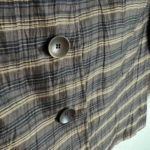 Excellent preowned condition. Brown striped 3/4 sleeve cropped lined button up blazer. Fabric has a wrinkled look to it. Linen/Polyamide material. Approx. measurements: Shoulder to hem 19", pit to pit 19", sleeve from neck to sleeve hem 19". Size 4.