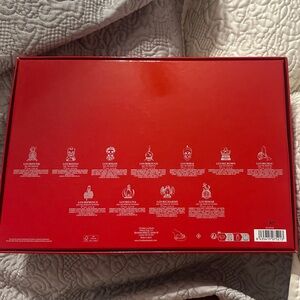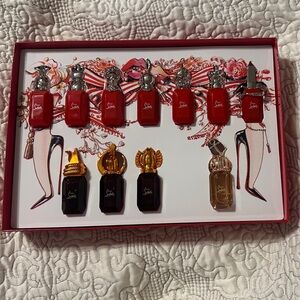 A luxurious and qualitative glossy red box sublimated with a colorful illustration, presenting the miniatures of the Loubiworld Fragrance Collection: 7 eaux de parfums, 3 eaux de parfum intenses and the eau de parfum légère.