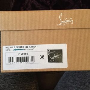 Christian Louboutin Spikes heels in aquamarine. Size 38, 5” covered heel and only used once. They come in original box including duster and two replacement heel coverings.