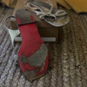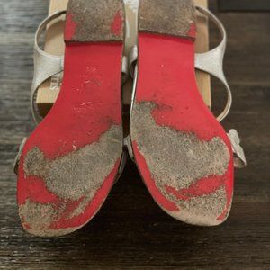 Authentic *red bottom* Christian Louboutin "Bellatong" sandal in size 38.5 / Color: Silver nappa leather.