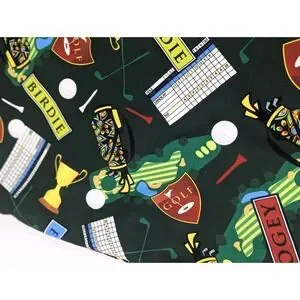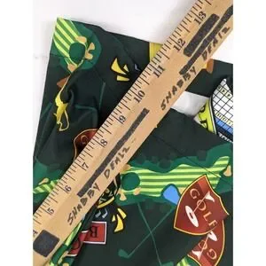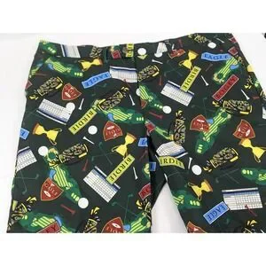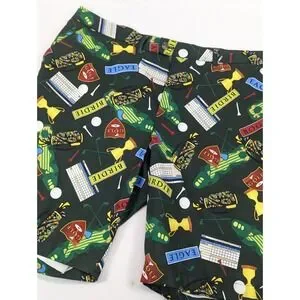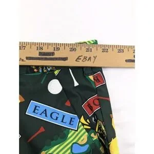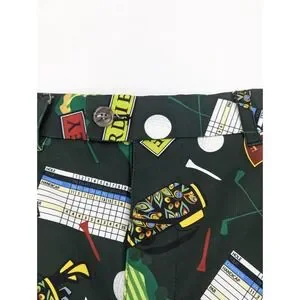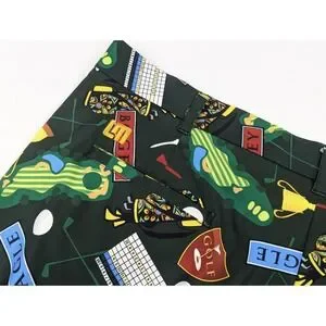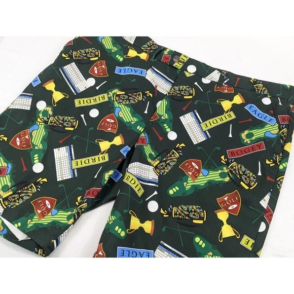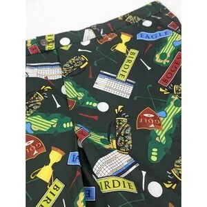 The Loudmouth Golf Shorts for men in size 42x10.5 offer a comfortable and stylish option for golfing or casual wear. Made from polyester jersey fabric with a mid-rise and flat front, these shorts feature a button closure, slash pockets, and a colorful golf birdie score card pins clubs pattern. The stretchy and breathable material ensures ease of movement and moisture-wicking properties, making them suitable for spring, summer, and fall seasons. Perfect for the preppy and sporty man who values both performance and style on and off the golf course.