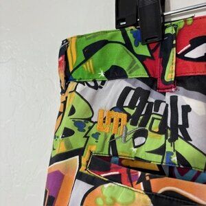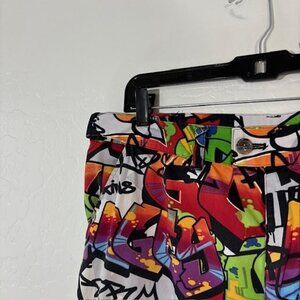 Design: Multicolor street art/graffiti pattern with vibrant reds, greens, purples, oranges, and black on white base