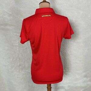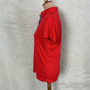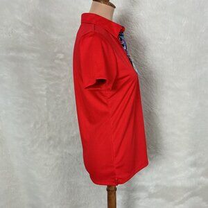 This is a red, tropical floral trim, short sleeve polo shirt from Loudmouth. NWT, bnwt, brand new with tags No flaws. 100% polyester. For reference the mannequin is a size 6-8 with measurements of: 34 in 26 in 35 in.