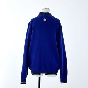 Blue wool sweater with yellow trim & yellow embroidered dachshund on chest.